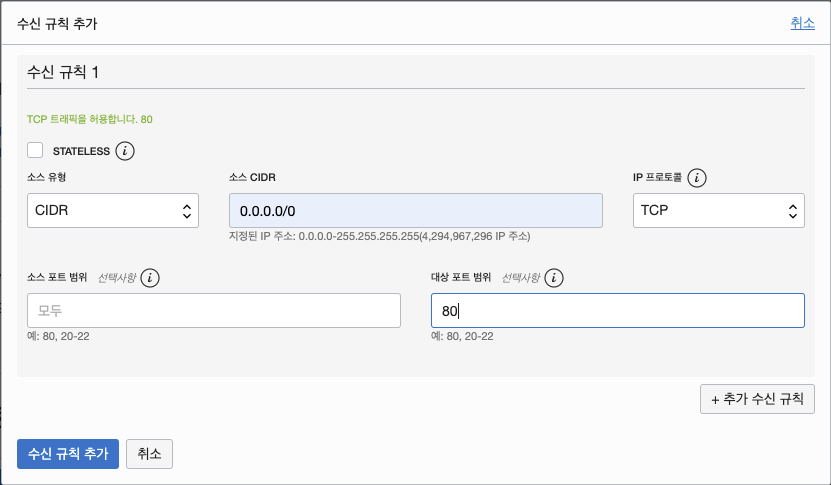 Oracle Cloud Infrastructure에서 특정 포트로 접근 허용하기를 참조합니다.